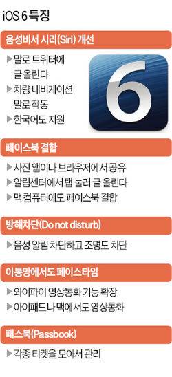 애플, 개발자 콘퍼런스서 'iOS6' 공개영화관 예약 등 기능 추가…BMW에 음성 길안내 장착자체 제작 지도앱 탑재…'페북'에 바로 사진 전송