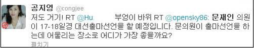 발단은 김경수 노무현 재단 봉하사업본부장의 트윗이었다. 김 본부장은 지난 11일 자신의 트위터(@opensky86)에 "문재인 의원이 17~18일쯤 대선출마선언을 할 예정입니다. 문 의원이 출마선언을 하는데 어울리는 장소로 어디가 가장 좋을까요?"라는 글을 남겼다.