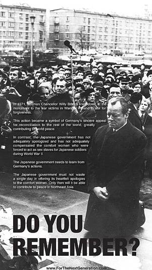 서경덕 교수가 지난 달 5월 29일 뉴욕타임즈에 게재한 일본군 종군 위안부 관련 전면광고에 빌린 브란트 전 총리의 사진을 삽입한 이유가 바로 여기에 있다. 일본이 독일의 용기 있는 행동을 배우고, 과거를 사죄하라는 의미다.