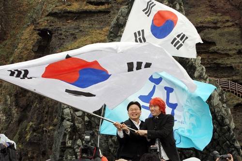 2011년 독도에서 열린 '독도 콘서트' 현장에서 태극기를 흔들고 있는 서경덕 교수와 가수 김장훈 ⓒ'스타뉴스' 임성균 기자 |