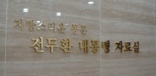 330㎡ 남짓한 자료실 문을 열고 들어서면, 1994년 4월 전 전 대통령이 모교인 대구공고를 방문해 학생들에게 강연했던 동영상이 벽면에서 상영되면서 육성녹음이 흘러나온다. 옆에는 대구공고 24회 졸업생인 전 전 대통령의 학생 시절 성적표가 전시돼 있다. 1학년 때는 60명 중 10등, 2학년 때는 14등, 3학년 때는 8등을 했다는 빛바랜 성적표를 유리관 안에 전시해놨다. 이밖에 장군 군복과 칼(지휘도), 12대 대통령 취임선서 사진, 1980년대 신문스크랩 등 대통령 재임 시절 업적을 미화하는 내용의 전시물에다 북한의 땅굴 사진 등으로 채웠다. 자료실 한켠 10여㎡ 크기의 별도 방은 의자·책상을 두고 좌우로 국기와 대통령 휘장을 걸어놓아 대통령 집무실처럼 꾸며놨다. 5분짜리 홍보영상물을 볼 수 있는 공간도 따로 마련돼 있다.
