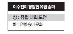 승마의 본고장 유럽과 한국의 격차는 어마어마하다. 한국 승마 수준은 유럽에 비하면 규모 저변 문화 등 모든 면에서 크게 뒤져 있다. 일간스포츠는 2010년 11월부터 2012년 3월까지 벨기에에서 승마 유학을 한 국가대표 마장마술 선수 이수진(25·연세대학원)의 도움말로 유럽승마를 2회에 걸쳐 소개한다.