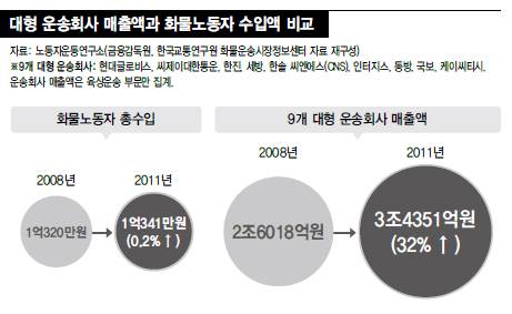반면 대기업 운송회사들은 막대한 매출을 올리고 있다. 노동자운동연구소의 '운송사와 화물노동자의 분배 구조 분석' 보고서를 보면, 현대글로비스 등 9개 대형 운송회사들은 2008년에 견줘 지난해 육상운송 부문 매출이 32%나 늘었다. 화물노동자 운임 총수입은 0.2% 증가하는 데 그쳤다. 보고서를 쓴 노동자운동연구소 공성식 연구원은 "화물노동자의 생존 위기는 왜곡된 운송시장구조로 인한 불평등한 소득분배의 누적된 결과"라며 "정부와 업체는 화물노동자의 운임 인상과 표준운임제 도입 요구를 당장 수용해야 한다"고 지적했다.