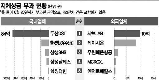지난해 국내 방산기업과 국외 방산기업에 부과한 지체상금도 확연히 차이난다. 지난해 국내 30개 방산기업에 부과한 지체상금은 총 537억이지만 외국 30개 방산기업에는 116억 7000만원에 불과하다. 올해는 6월까지 국내 30개 방산기업에 139억, 외국기업에 38억 4000만원이 부과했다.