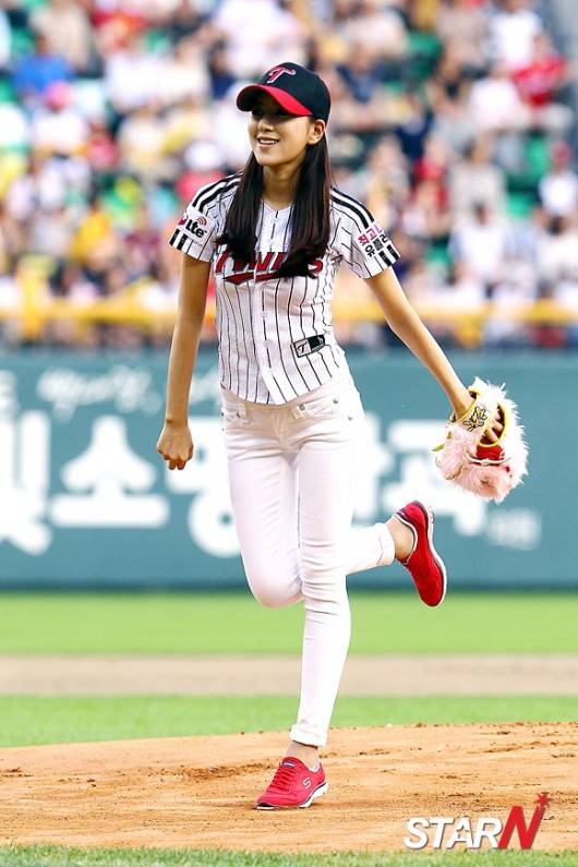 28일 오후 서울 잠실 야구장에서 '2012 팔도 프로야구' LG 트윈스와 KIA 타이거즈 경기에서 배우 최윤소가 시구를 하고 있다.