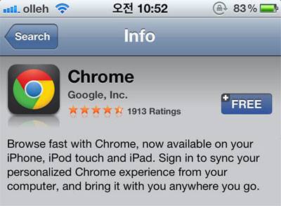 이에 구글 크롬 앱을 아이폰4에 직접 내려받아 설치하고 사용해 보았다. 확실히 구글 크롬 앱을 이용하니 인터넷에서 검색한 내용이 표시되는 속도가 빨랐다. 개인적인 생각일 수도 있지만, 아이폰 기본 브라우저인 사파리 앱보다 구글 크롬 앱이 좀 더 빠른 것을 느낄 수 있었다.