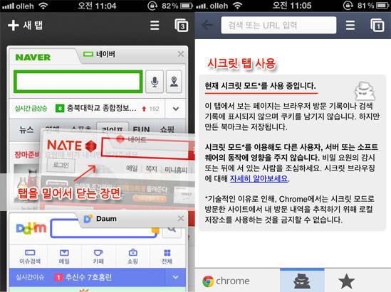특히 탭(인터넷 창)을 열고 관리하는 기능이 매우 편리했다. 사파리 앱에서는 탭을 8개까지만 이용할 수 있지만, 구글 크롬 앱에서는 탭의 개수를 무제한으로 지정할 수 있다. 여러 개의 탭을 한눈에 볼 수 있는 것도 편리하다. 화면 가장자리를 드래그하면 탭을 전환할 수 있다. 탭을 닫고 싶으면 오른쪽 상단의 X표를 누르거나 탭을 옆으로 슬쩍 밀면 된다. 인터페이스 방식이 매우 직관적이라 구글 크롬 앱을 처음 접한 사람도 쉽고 편리하게 사용할 수 있을 것으로 예상한다. '시크릿 탭'를 사용하면 해당 페이지는 브라우저 방문 기록이나 검색 기록에 표시되지 않으며 쿠키를 남기지 않는다. 인터넷 탐색 기록을 남기고 싶지 않은 경우 사용하면 유용하다.