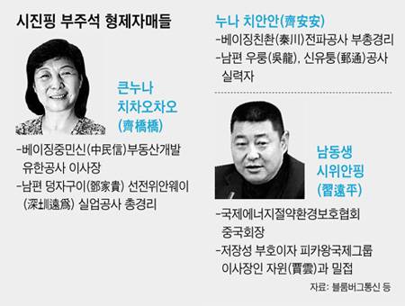 블룸버그 통신은 자체 입수한 공문서들을 통해 시 부주석의 큰누나 치차오차오(齊橋橋) 가족이 희토류와 희귀금속 관련 기업의 지분 18%와 또 다른 기술 관련 기업의 지분 2000만달러어치를 보유하고 있다고 보도했다. 미국의 스마트폭탄 제조에 쓰이는 희귀금속 가격이 중국의 공급 제한으로 급등하면서 이들 부부는 큰 수익을 올린 것으로 알려졌다. 치차오차오 부부가 부동산 회사인 선전위안웨이(深?q遠爲)투자회사에 갖고 있는 지분은 2011년 말 현재 약 2억8800만달러에 달한다. 시 부주석의 누나 성이 치(齊)씨인 것은 부친 고 시중쉰(習仲勛) 부총리가 시(習)씨는 너무 드물어 눈에 띄는 게 걸린다면서 딸들의 성은 부인의 성인 치씨를 따르게 했기 때문이다.