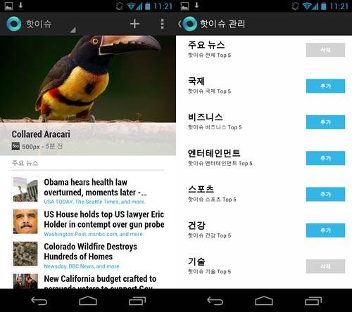 ◇ 편리해진 검색 기능 = 구글IO 기조연설에서 시연됐던 '구글나우' 기능도 써 볼 수 있다. 홈 버튼을 오래 누른 상태에서 위로 손가락을 올려 구글 마크를 선택하거나, 화면 위쪽에 보이는 검색바를 터치하면 바로 이 기능이 실행된다.