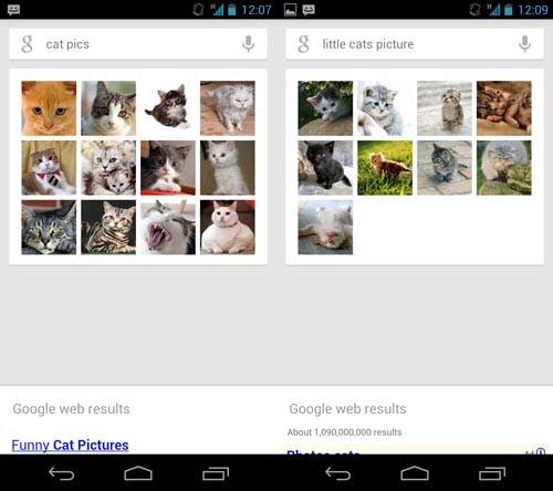 언어를 영어로 설정한 다음 음성 검색을 이용해 'cat pics'라고 말하자 예전에 볼 수 있었던 구글 검색 결과 화면 대신 고양이 사진만 모아서 먼저 보여준다. 'cat pics'라는 말의 의미를 검색엔진이 알아차린 것이다. 아기고양이 사진을 보고 싶어서 'little cats picture'라고 말했더니 이번에도 마찬가지로 아기고양이 사진을 먼저 보여준다. 물론 이 화면을 옆으로 밀어서 치우면 예전처럼 글자들만 나열된 검색 결과를 볼 수 있다.