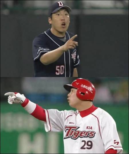 ◇ 신일고 2년 선후배 사이인 나지완과 김현수가 경기 도중 말다툼을 벌이고 있다. ⓒ MBC 스포츠플러스 중계화면 |
