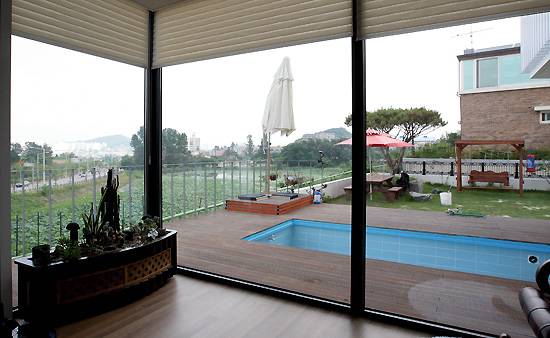 ⓒ시사IN 백승기 1층 거실(위)에서도 연꽃 연못이 건축주의 집안 연못이 되는 효과를 거두었다. 마당에 놓인 수영장은 딸뿐만이 아니라 동네 아이들의 놀이터다. |