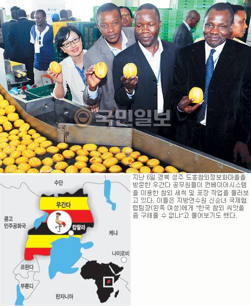 지난 6일 경북 성주 도흥참외정보화마을 등 남동부 지역의 농·산업 시설 등을 견학하던 아프리카 우간다 공무원 20명과 동행 투어를 했다. 이들은 한국국제협력단(KOICA) 초청으로 지난달 21일 입국해 행정안전부 지방행정연수원에서 위탁연수 중이었다. 사무엘 이투(51) 지방행정부 인사과장과 19명의 군수 또는 부군수들이다. 이들의 목적은 단 하나다. "우리도 한국처럼 잘살고 싶다. 끝도 없는 가난에서 벗어나고 싶다."