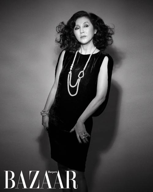 이번 화보촬영에서는 평소의 국민 엄마의 이미지를 벗고 고급스러운 소재감이 돋보이는 블랙 원피스에 클래식하면서도 개성 있는 디자인의 진주 네크리스를 매치해 여성성을 강조했다. 특히 한껏 부풀린 헤어스타일과 글램한 아이 메이크업이 여느 헐리우드 여배우 부럽지 않은 섹시함을 고스란히 드러냈다.