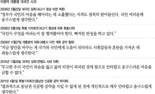 이명박 대통령은 미국산 쇠고기 수입 문제로 인한 촛불시위 때부터 이번 친형의 비리 문제까지 집권기간 중 모두 7번 사과했다.