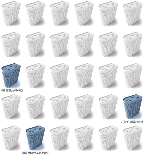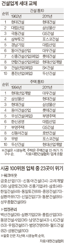 대한건설협회에 따르면 50년 전인 1962년 30대 건설사에 속했던 업체들 가운데 현대건설·대림산업을 제외하고 대부분 문을 닫았거나 어려움을 겪고 있다. 20개는 사업을 접었고 3곳의 주인이 바뀌었다. 현재 워크아웃(기업개선작업) 중이거나 법정관리를 받는 기업이 다섯 군데다. 건설면허 1~30호 업체 가운데 현대건설·롯데건설(옛 평화건업)·코오롱글로벌(옛 코오롱건설) 정도만 제대로 살아남았다. 건설면허 3호인 풍림건설 등 23곳이 사라졌고 4호인 신성건설 등 4곳은 법정관리나 워크아웃으로 어려움을 겪고 있다.