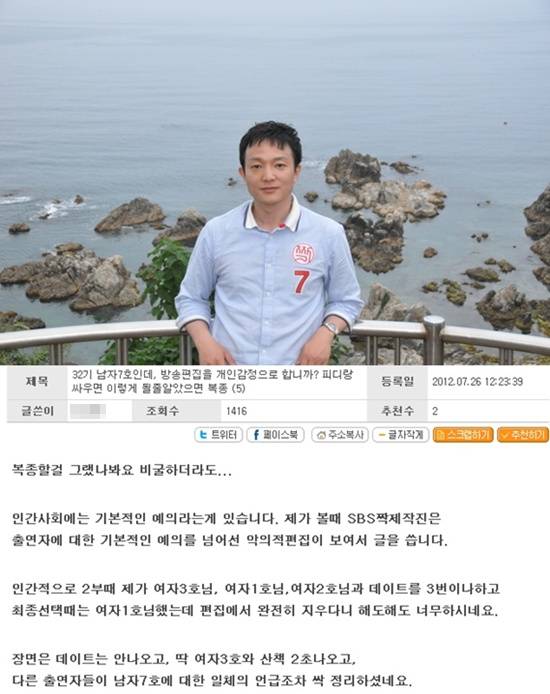 '짝' 남자7호, 편집에 불만 "출연자 미워도 정도껏 하라"