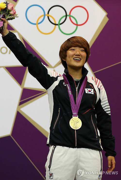 (런던=연합뉴스) 전수영 기자 = 한국 여자 사격의 '신성' 김장미(부산시청)가 김장미는 1일 오후(한국시간) 영국 런던 그리니치파크 왕립 포병대 기지의 올림픽 사격장에서 열린 대회 5일째 여자 25m 권총 결선에서 201.4점을 쏴 본선 591점과 합계 792.4점으로 우승, 시상식대에서 손을 들어 인사하고 있다. 2012.8.2