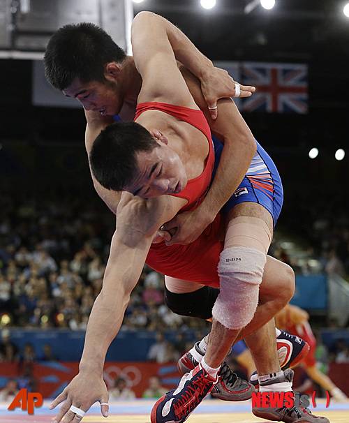 【런던(영국)=AP/뉴시스】5일(현지시간) 영국 런던 엑셀 제2 노스 아레나에서 열린 런던 올림픽 레슬링 그레코로만형 남자 55kg 이하급 예선에서 한국 최규진과 북한 윤원철이 접전을 벌이고 있다. 최규진은 북한 윤원철을 맞아 세트스코어 2-0으로 승리해 8강에 진출했다.