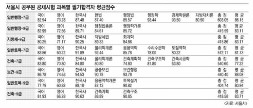 8일 서울신문이 올 서울시 공무원 7~9급 공채시험에서 채용규모가 큰 8개 직렬의 과목별 합격자 평균점수를 정보공개 청구·분석한 결과 이같이 밝혀졌다. 서울시가 직급·직렬별 과목 평균점수를 공개한 것은 처음이다. 청구대상 직렬은 9급 일반행정·지방세·보건·일반토목·건축직과 7급 일반행정·일반토목·건축직 등이다.이들 직렬 합격자의 전과목 평균는 77.22(7급 건축)~88.08점(9급 보건)으로 직렬별 큰 차이가 없었다. 하지만 과목별 점수는 사정이 달랐다.
