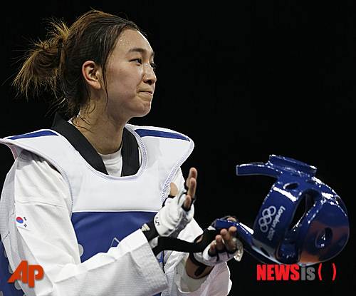 【런던=AP/뉴시스】한국 태권도 국가대표선수 황경선이 10일 런던올림픽 여자 태권도 67㎏급 준결승에서 슬로베니아의 프랑카 아니치를 꺾고 기뻐하고 있다.