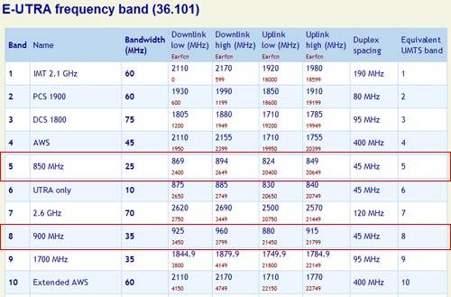 이 자료에 따르면 아이폰5는 LTE 주파수 대역 중 1, 2, 4, 5, 8, 13, 17 등 총 7개 대역폭을 쓰게 될 전망이다. 그런데 주목할 것은 5·8번 대역이다. 5번 대역은 상향 824~849MHz, 하향 869~894MHz를 쓰며 흔히 '850MHz'로 불린다. 8번 대역은 상향 880~915MHz, 하향 925~960MHz를 쓰며 보통 '900MHz'로 불린다.