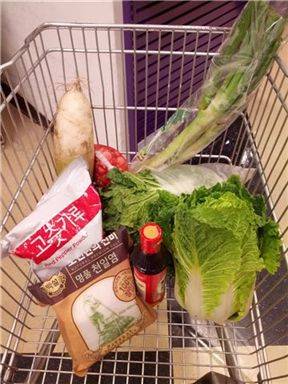 본격적으로 김치 양념에 필요한 재료를 담기 시작했다. 배추 3포기에 부추 2030원(500g), 무 1830원, 다듬지 않은 대파 2000원, 마늘 4230 원(500g), 생강 1400원(150g), 고춧가루 3만1480원(500g), 까나리액젓 3350원(750g), 새우젓 6160원(250g), 절임용 소금 2930(1Kg). 총 6만1110원이 들었다. 재래시장에서 큰 배추 3포기 살 경우 6만7410원이 든다.