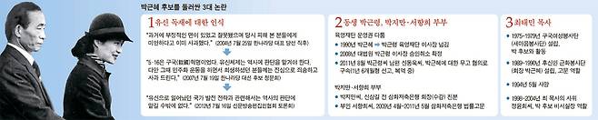 ◆가족을 둘러싼 구설=두 친동생 박근령(58) 육영재단 전 이사장과 박지만(54) EG 회장, 그리고 박 회장의 부인 서향희(38) 변호사와 관련된 구설도 박 후보를 괴롭히고 있다. 박 전 이사장은 90년부터 육영재단 운영권을 놓고 박 후보와 22년째 불편한 사이다. 박 전 이사장은 2008년 육영재단 이사장직을 뺏기자 박 후보와 박지만 EG 회장을 상대로 법적 다툼까지 벌였다. 박 전 이사장의 남편이자, 박 후보의 제부인 신동욱(44)씨는 육영재단과 관련해 박 후보와 박지만 회장에 대해 비방글을 유포했다가 명예훼손과 무고 혐의로 1년6개월의 실형을 선고받고 서울구치소에서 복역 중이다. 남편이 구속된 뒤 박 전 이사장은 올해 4·11 총선에서 육영수 여사의 고향인 충북 보은-옥천-영동 선거구에 출마하고자 통일선진당에 공천을 신청했다 낙천했다.