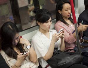 ↑ 5월 30일 중국 홍콩 지하철 객차에서 승객들이 스마트폰을 보고 있다. |