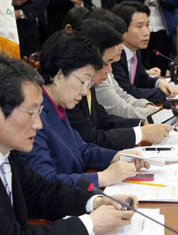 ↑ 1월 30일 민주통합당 최고위원회의. 당시 문성근 최고위원, 한명숙 대표, 김진표 원내대표(왼쪽부터)가 자신의 발언을 마친 뒤 스마트폰으로 문자메시지를 보내느라 다른 참석자의 발언에 집중하지 못하고 있다. |