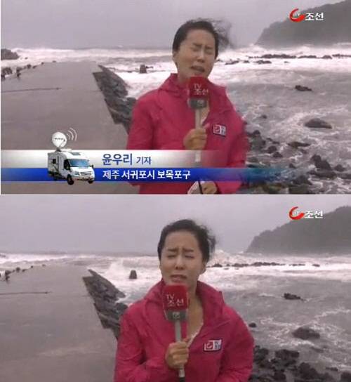윤우리 기자는 제주 서귀포시 보목포구에서 전역 태풍 볼라벤 영향권에 든 제주시의 위력을 전했다. 윤우리 기자가 보도를 할 당시 제주는 남쪽 먼 바다에서 태풍경보가 내려져 해안에 최고 6.5미터의 높은 파도가 이는 것은 물론 초속 13.3m의 바람이 불고 있는 긴박한 상황이었던 것으로 알려졌다.