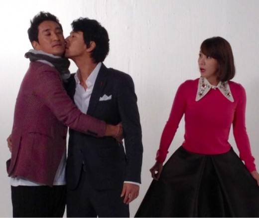 파격적인 포즈가 인상적이었다. 신현준은 한재석을 끌어 안고 입맞춤을 느끼고 있다. 김정은은 두 사람을 보고 깜짝 놀란 표정을 짓고 있어 웃음을 자아냈다.