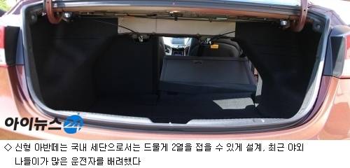 이와 함께 아반떼가 준중형 세단이지만 최근 야외활동이 많은 운전자를 위해 2열을 일부 혹은 전체를 접을 수 있게 했다. 이에 따라 트렁크에서나 2열 시트 옆에서 쉽게 2열을 접었다 폈다 할 수 있다.
