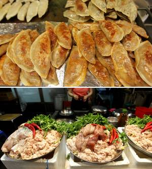 잔칫날이다. 온통 빈대떡 지지는 냄새에 온몸이 휘청댄다. 맛도 맛이지만 시장 한가운데 십자형으로 길게 뻗은 포장마차촌은 보기만 해도 흥겹다. 포장마차는 줄마다 특색이 있다. 빈대떡과 온갖 전이 막걸리를 친구 삼아 맛을 뽐내는 줄은 추석 명절이 따로 없다. 노릇노릇 익은 빈대떡은 탑처럼 높이 올라가 주인을 기다린다. '순희네 빈대떡'은 14년째 가격이 같다. 한 장에 4000원. '부안집 복순네'에는 김을순(68)씨가 광어 한 마리를 통째로 부친다. "광어를 잘라서 부쳐 파니 안 팔려서 통으로 부쳤지." 포장마차의 한쪽 줄은 순대, 족발 라인이다. 모둠회 라인도 있고 보리밥을 파는 줄도 있다. '원조, 쌀, 보리밥'은 전영순(80)씨가 48년째 보리비빔밥을 팔고 있다. 멸치, 고추를 같이 넣어 조린 양념은 이 집만의 맛을 내는 비법이다. 일명 꼬마김밥을 파는 '모녀꼬마마약김밥'은 이미 명물로 유명하다. 해가 질수록, 비가 많이 올수록 시장골목은 사람들로 북적인다.