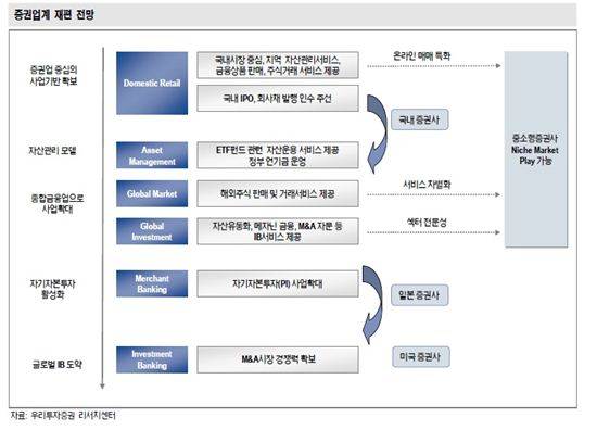 우 애널리스트는 "한국 증권산업도 일본이 겪었던 과정이 진행되고 있다"며 "천편 일률적인 비즈니스 모델에서 벗어나 ▲대형사 ▲중소형 특화증권사 ▲온라인 증권사 등의 세분화를 통해 업계가 재편될 것"이라고 전망했다.