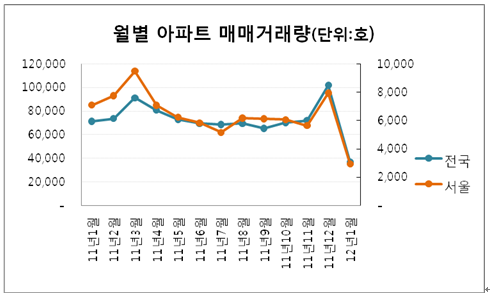 또 취득세 감면 혜택이 종료된 올 1월에는 아파트 거래량이 급감한 것으로 나타났다. 주택 취득세 50%감면 혜택이 종료되던 2011년 12월에 전국 아파트 거래량은 10만1622호이었으나 올 1월에는 무려 63.5%가 줄어든 3만7051호으로 줄어들었다. 서울 아파트 거래량 역시 작년 12월에는 7918호였으나 올 1월에는 2959호로 63%가 줄었다.