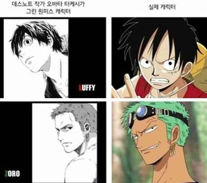 게재된 게시물은 일본 만화 '데스노트' 작가인 오바타 타케시가 오다 에이치로의 만화 '원피스' 캐릭터를 그린 것으로, 오다 에이치로와는 또 다른 스타일의 원피스 캐릭터를 표현해내 시선을 고정시킨다. 그만의 특유의 그림체로 새로운 원피스 캐릭터를 재탄생 시킨 것.