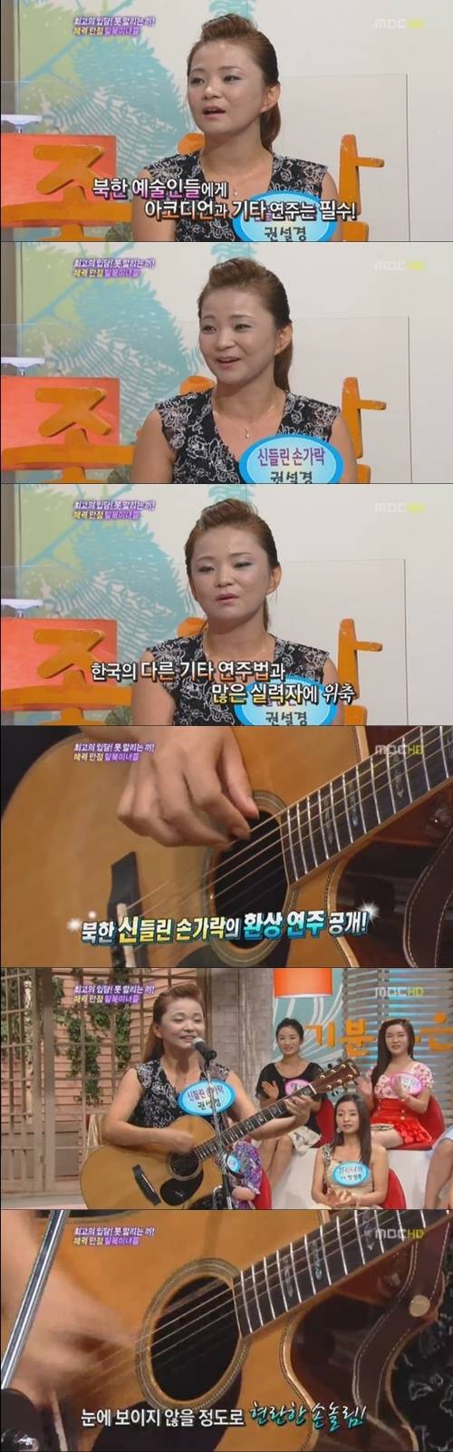 탈북녀 권선경은 9월18일 방송된 MBC '기분좋은날'에서 북한에서 기타를 연주한 '신들린 손가락'이라고 자신을 소개했다.