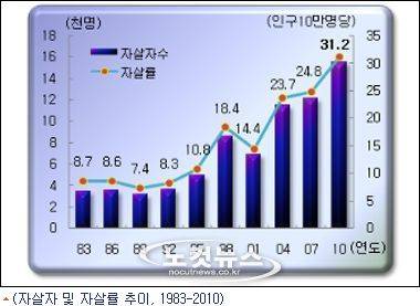 우리나라의 2011년 10만 명당 자살률은 31.7명으로 2010년의 31.2명보다 0.5명 더 늘어났다. 이는 OECD 평균인 12.8명의 3배 가까운 것이다.