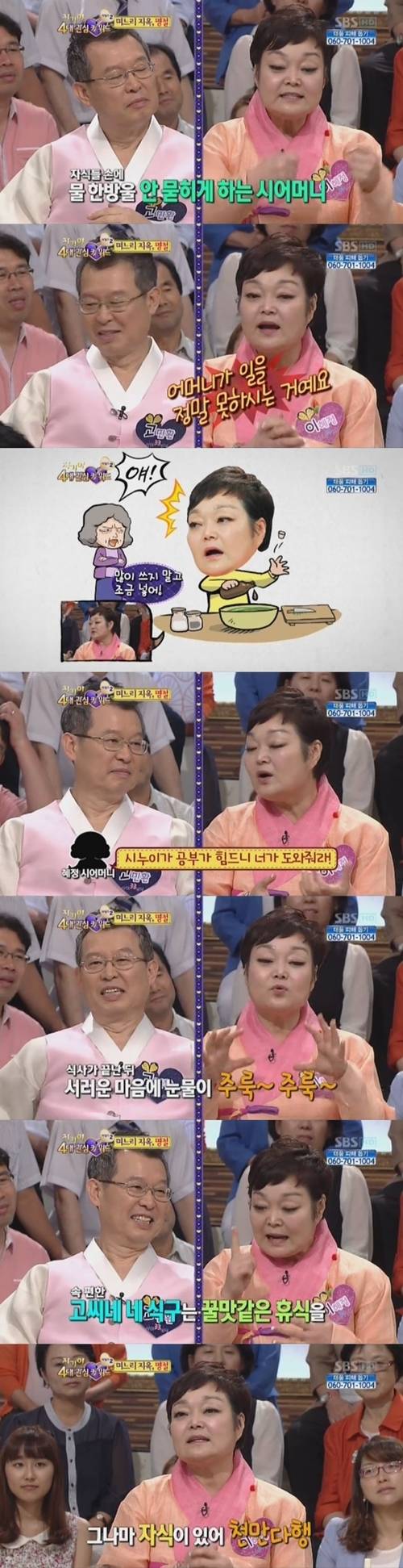 이혜정은 "그런데 어머니가 일을 정말 못한다. 음식을 해놔도 별로 먹고싶지 않다"며 "그래서 내가 해놓으면 아버님이 좋아하셨다. 그때 당시 참기름을 넣으려고 하면 뒤에서 조금만 넣으라고 어머니가 나를 불렀다. 지금도 참기름 넣을 때마다 뒤를 돌아본다"고 밝혔다.이어 이혜정은 "시누이가 시누님인지 시누X인지는 모르겠다"며 "식사가 끝난 뒤 눈물이 그렇게 났다. 고씨네 네 식구는 과일 먹고 차 마시는데 하나밖에 없는 이씨인 나는 수저와 접시 다 닦고 있었다. 왜 결혼했지 싶은 생각을 하면 시어머니가 또 불렀다"고 서러웠던 당신 기억을 떠올렸다.