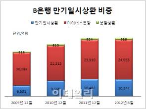 은행마다 약간의 차이는 있지만, 원금과 이자를 함께 갚아가는 '원금 분할상환'의 비중은 상당히 낮았다. A은행은 만기 일시상환 비율이 93.1%에 달했다. 이 은행의 전체 신용대출 4조 9664억원 중 4조 6250억원이 만기 일시 상환식이다. B은행도 마찬가지다. 지난 8월 말 기준으로 분할 상환 비중은 9.5%(986억 원)에 불과했다. 나머지인 90.5%(1조 134억원)가 이자만 갚다가 만기 때 원금만 갚게 돼 있다.
