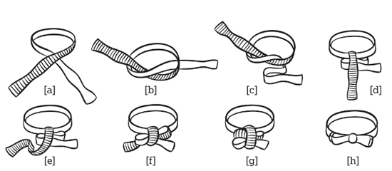1 타이를 늘어뜨려 왼쪽이 오른쪽보다 살짝 길게 위치하게 자리 잡는다. [a] 구두끈을 묶을 때처럼 긴 쪽을 짧은 쪽 위로 교차시켜 아래로 밀어넣는다. [b] 잠시 긴 쪽은 목 뒤로 넘겨 놓는다. [c] 2 짧은 쪽을 그림 [c]처럼 나비넥타이 스냅으로 만 다음, 목 뒤에 넘겨 두었던 긴 쪽을 늘어뜨려 위치시킨다. [d] 3 긴 쪽을 어깨 쪽으로 위치시킨 다음 [e], 검지를 가운데 넣어 반대쪽으로 누르고 있던 나비 모양을 감아준다. [f] 구멍을 통과할 때 긴 쪽 끝이 짧은 쪽을 감싸고 있어야 한다. [g] 4 가볍게 나비넥타이를 묶어주고, 타이 모양이 가지런하게 마음에 들 때까지 이리저리 매만진다. [h] 언제 어디서나 쓸모있는 4가지 패션다음에 제시하는 4가지 기본 패션 아이템을 구비해두면 대체로 패션 센스가 없다는 망신살만은 피할 수 있을 것이다.