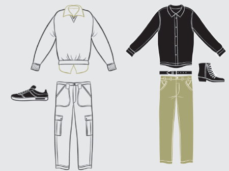 유명 영화배우나 록 스타들도 구부정하게 걸치고 다녀도 무방할 정도로 평이하고 부담 없는 스타일. 상의와 하의를 매치시키는 방법에 딱히 공식은 없다. 컬러나 셔츠 끝을 바깥으로 내어도 되고, 안으로 넣고 다녀도 좋고, 색이 바랜 진이나 카고 팬츠로 대체해도 좋다. 예상치 못한 회의나 중요한 식사자리가 생겼다면, 그냥 깔끔하게 셔츠 끝을 바지 속으로 집어넣고 손으로 머리를 빗어주면 되는 스타일이다.