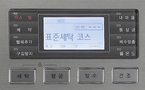 현재 진행상태는 대형 LCD창으로 확인할 수 있다. 남은 시간은 숫자로, 전체 진행 상태는 막대 그래프로, 현재 작동 중인 기능은 한글로 보여준다. 그 뿐 아니라 물 온도와 헹굼 횟수, 세탁 코스까지 일목요연하게 보여줘서 편리하다. 남은 시간은 빨랫감 상태에 따라 유동적으로 바뀌지만 오차는 적은 편이다.