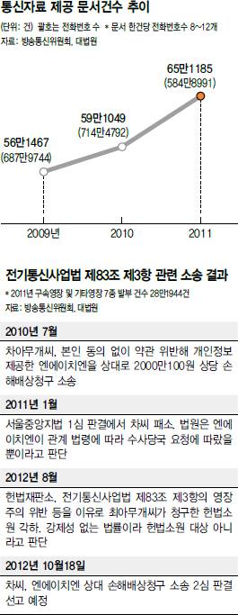 인터넷 포털 등 통신사업자들이 수사기관에 넘겨주는 가입자 전화번호 수는 한해 580만여건에 이른다. 이런 정보 제공은 전기통신사업법(83조3항)에 바탕을 두고 있다. 이 조항을 두고는 헌법상 영장주의를 배제해 위헌이라는 논란이 제기됐지만, 지난 8월 헌법재판소는 이 법률에 대한 헌법소원을 각하했다. 아직도 현재진행형인 이른바 '회피 연아 동영상' 사건 관련 소송도 이 문제와 긴밀히 얽혀 있다.