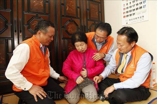 Hanwha Group executives deliver a padded jacket during their visit to a senior citizen who lives alone in Seoul on Tuesday. (Hanwha Group) |