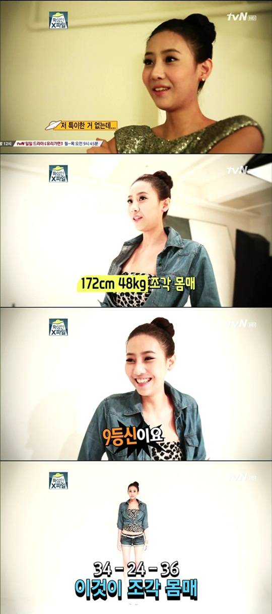 이후 제작진은 직접 김가담의 허리치수를 재 24인치임을 공개했고 172cm에 48kg의 조각몸매의 소유자라는 것을 강조했다.