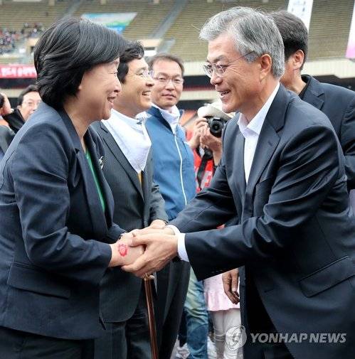 (서울=연합뉴스) 백승렬 기자 = 민주통합당 문재인 대선후보와 심상정 의원이 20일 잠실종합운동장에서 열린 전국 공무원노동조합 총회에서 인사하고 있다. 2012. 10. 20