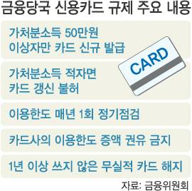 앞으로 가처분소득이 월 50만원을 밑돌면 신용카드를 새로 만들지 못한다. 대출 연체자나 저소득자가 무분별하게 신용카드를 발급하는 폐단을 막기 위한 조치다.