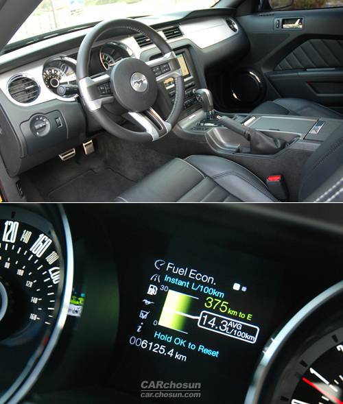 서울 잠실에서 용인서울고속도로를 타고 수지를 돌아오는 코스로 2013년형 머스탱 쿠페를 시승했다. 시동을 거니 엔진 소리가 웅장하게 들린다. 천천히 주행을 시작했다. 일반도로에서 용인서울고속도로 진입할 때까지 시속 60~80km로 주행했다. 주행해보니 시속 80km 정도의 속도에서 진동과 소음이 적은 편이고, 미묘한 조작에서도 절묘하게 대응한다. 날씨가 화창해 라디오를 키고 지붕을 열었더니 풍부한 사운드가 귀를 즐겁게 한다. 이는 서브우퍼 2개와 8개 스피커로 이루어진 쉐이커 오디오 시스템이 장착됐기 때문인데 이로 인해 공연장에서 느낄 수 있는 생생한 음질을 즐길 수 있다. 글라스 루프가 있어 자외선차단제처럼 유리가 자외선의 96%를 차단해줘 자연을 만끽하며 주행할 수 있다.